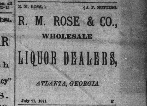 In 1867, Rufus M. Rose moved to Atlanta and began selling wholesale wine, liquor, and cigars. By the 1870s, he operated a retail store in downtown Atlanta and ran distilleries in Vinings, Georgia and Chattanooga, Tennessee. In 1894, he incorporated the business under the name R. M. Rose Company and, alongside his son Randolph Rose, ran the company while also serving as the secretary and treasurer of Mountain Spring Distillery, which produced “pure hand-made Georgia corn whiskey.”