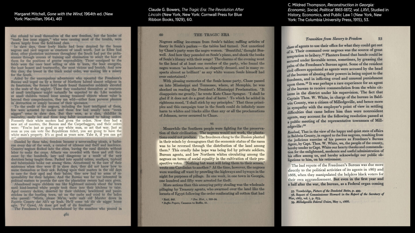 Mitchell responded to Everett’s critique, writing, “He is absolutely right in that matter and I thank him for calling my attention to it. […] I have tried to keep out venom, bias, bitterness as much as possible. All the V,B&B in the book were to come through the eyes and head and tongues of the characters, as reactions from what they saw and heard and felt.” [15] Her response to Everett is interesting for two reasons. First, it hints she was aware that her portrayal of Black people during Reconstruction was biased or bitter, which are fundamental flaws of the Dunning School works she relied on. Second, Mitchell implies she is planning to change this content. The published version of Gone With the Wind includes many long passages in which the book’s omniscient narrator delivers significant pieces of information about Reconstruction that echo the Dunning School and its biases. It would seem that Mitchell either chose not to edit her Reconstruction passages, or that they were originally much more problematic.