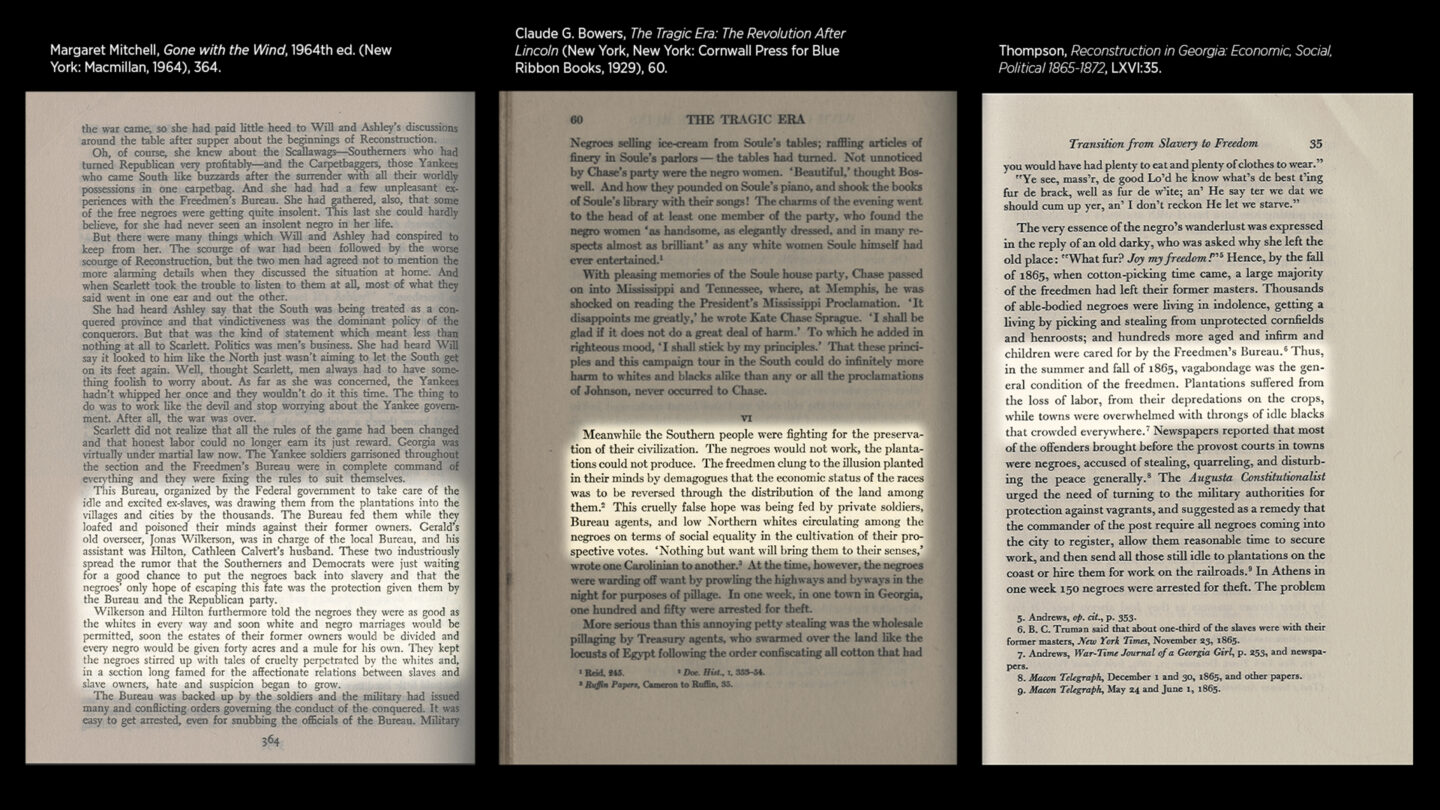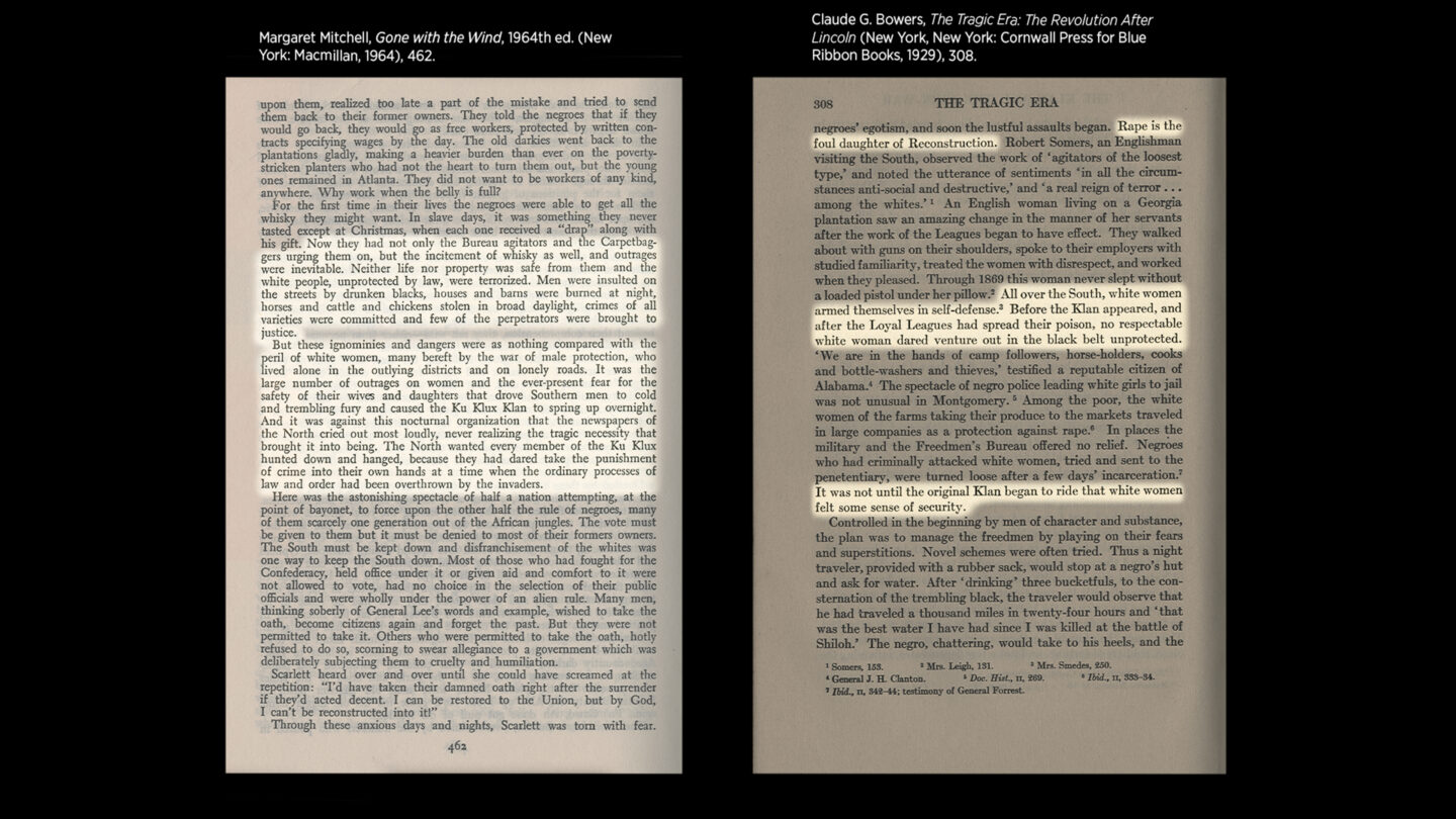 Margaret Mitchell’s letters and her bookshelf indicate that she owned and read these books. But the evidence for her use of Thompson, Bowers, and others’ works doesn’t stop there. GWTW also clearly reflects them. Mitchell pulled closely from both Bowers and Thompson, weaving their ideas into her storytelling in GWTW.